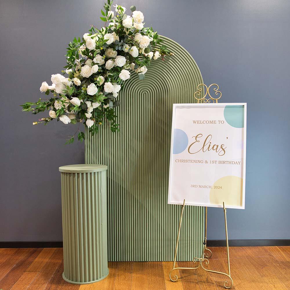 Home>Party Hire>Backdrop Hire>Party Hire Packages>Bloom Pak5 Ripple Arch, Ripple Plinth, Custom Poster, Easel & Floral Piece 93612